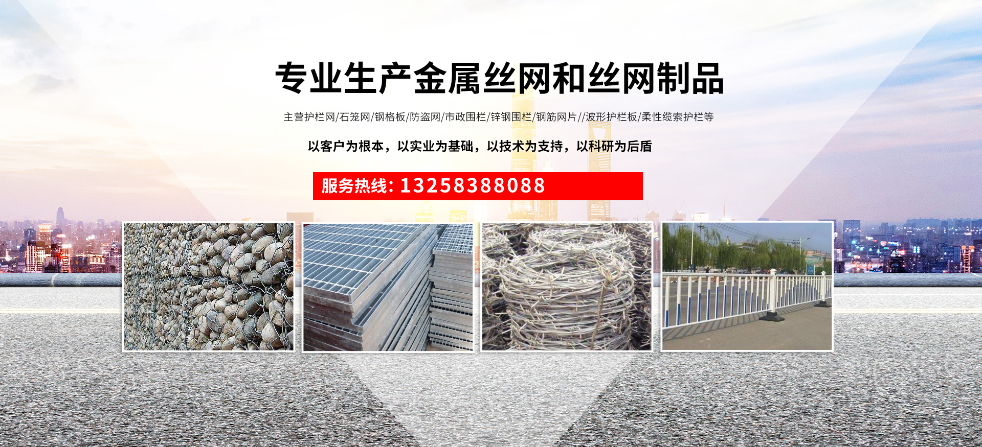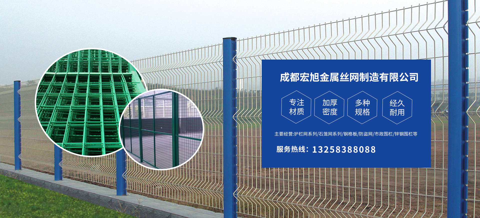 成都宏旭金屬絲網(wǎng)制造有限公司主營護欄網(wǎng)系列、石籠網(wǎng)系列、鋼格板、防盜網(wǎng)、市政圍欄、鋅鋼圍欄、鋼筋網(wǎng)片、聲屏障系列、波形護欄板、柔性纜索護欄、SNS邊坡防護網(wǎng)等其他絲網(wǎng)類產品。特殊規(guī)格可加工定做,也可根據(jù)客戶來圖來樣定做。自創(chuàng)業(yè)以來,公司一直堅持市場為導向,以客戶為根本,以實業(yè)為基礎,以技術為支持,以科研為后盾,集科研、生產、經營為一體,不斷研制開發(fā)新產品,開拓市場,走綜合發(fā)展之路。多年來,公司憑借過硬的質量,良好的信譽、優(yōu)質的服務、合理的價格,贏得了市場和商家的一致好評。